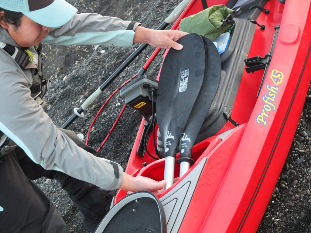 そして前ハッチに予備パドルをしまえる点で、前方がスッキリし、仕掛けが引っかかってしまったりが大幅に減少しました!