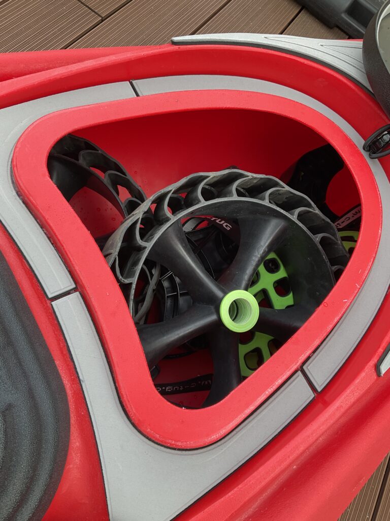 このバウ側の新しいハッチの中には、予備パドルやC-tugサンドトラックカヤックカートなどが入り、旧型のオープン型と違って海上でバウ側がごちゃごちゃすることなくトラブルも減るのではないでしょうか。
