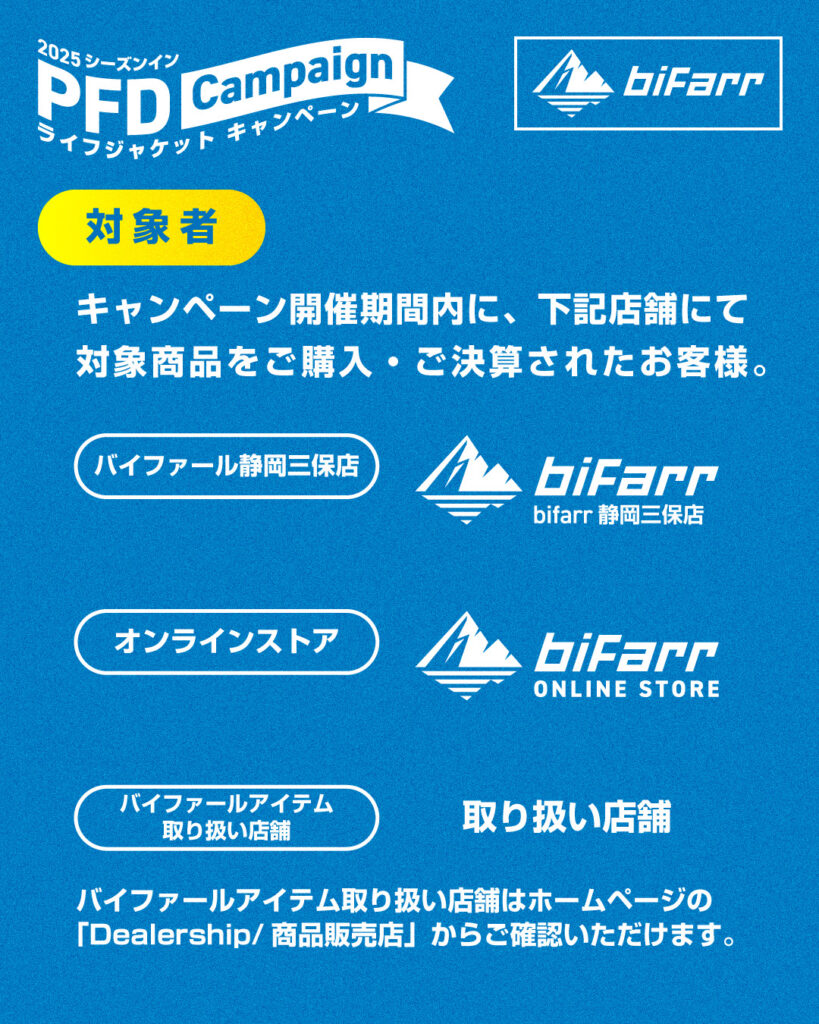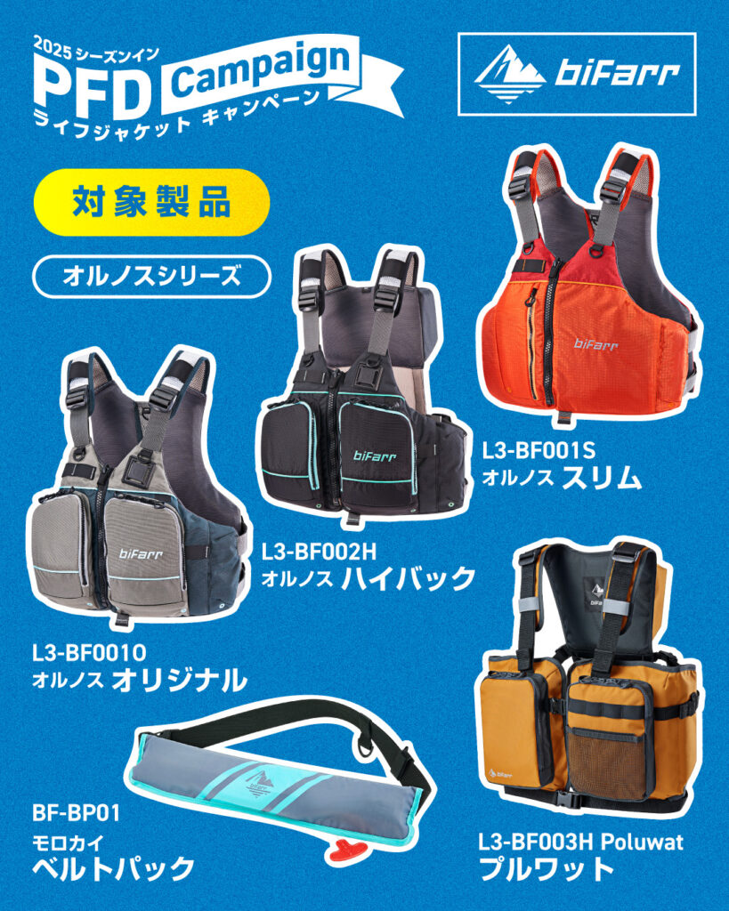 パドルフィッシングにおいて、PFD(ライフジャケット)は命を守るための重要な装備の一つです。本キャンペーン期間中、対象のPFDをご購入の方にバイファールオリジナルアイテムをプレゼント致します!
