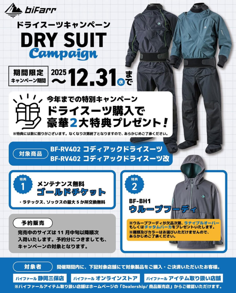 Bifarrでは現在ドライスーツ&ドライパンツをお得に買えるキャンペーンが開催中ですよ!